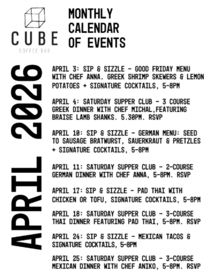 Cube Coffee Bar TWD hosts weekly chef-led dinners featuring three and four-course meals with carefully curated wine pairings. Enjoy seasonal, locally sourced cuisine crafted by in-house and guest chefs. Visit us in-store to learn more and say hello.